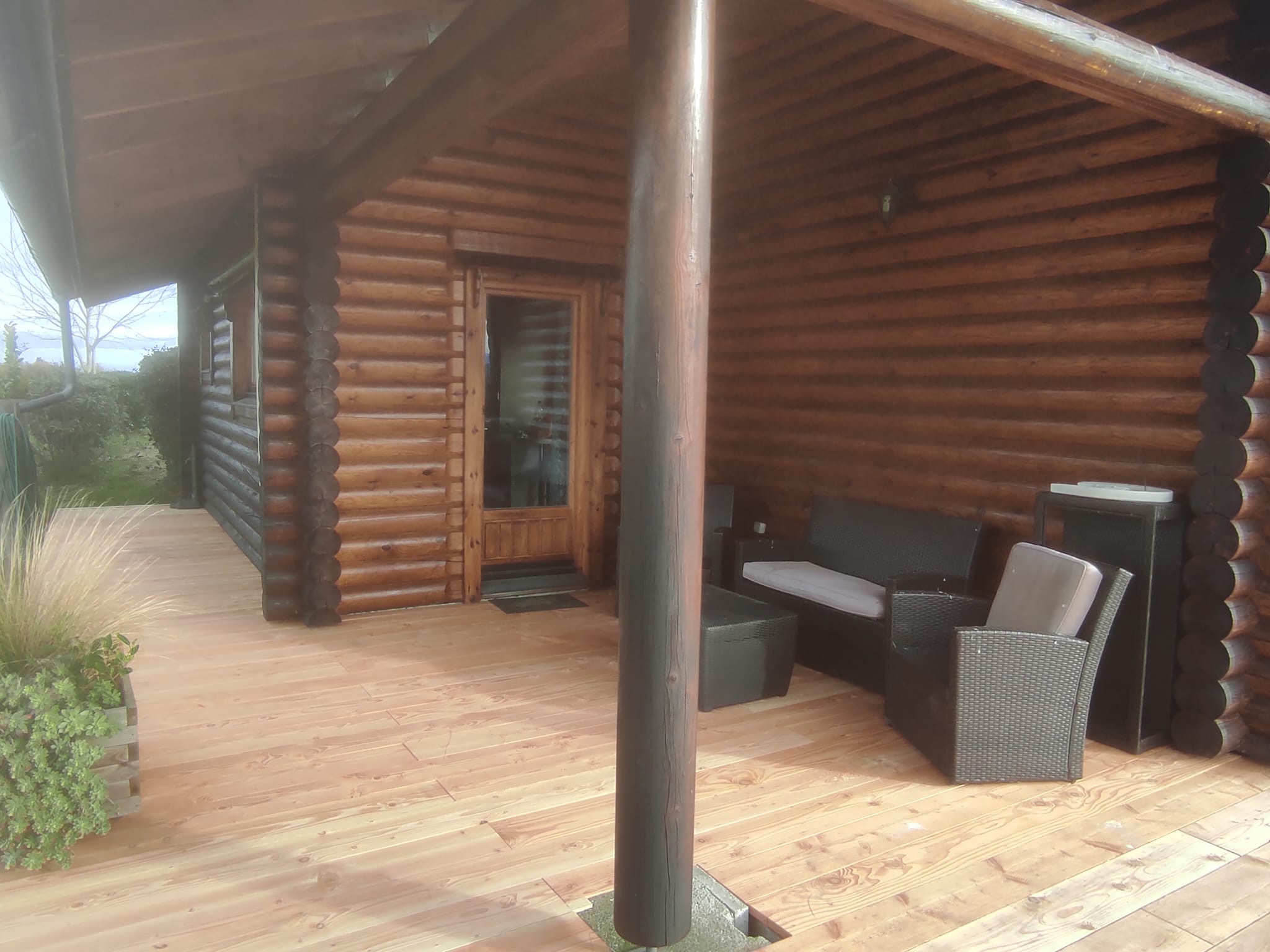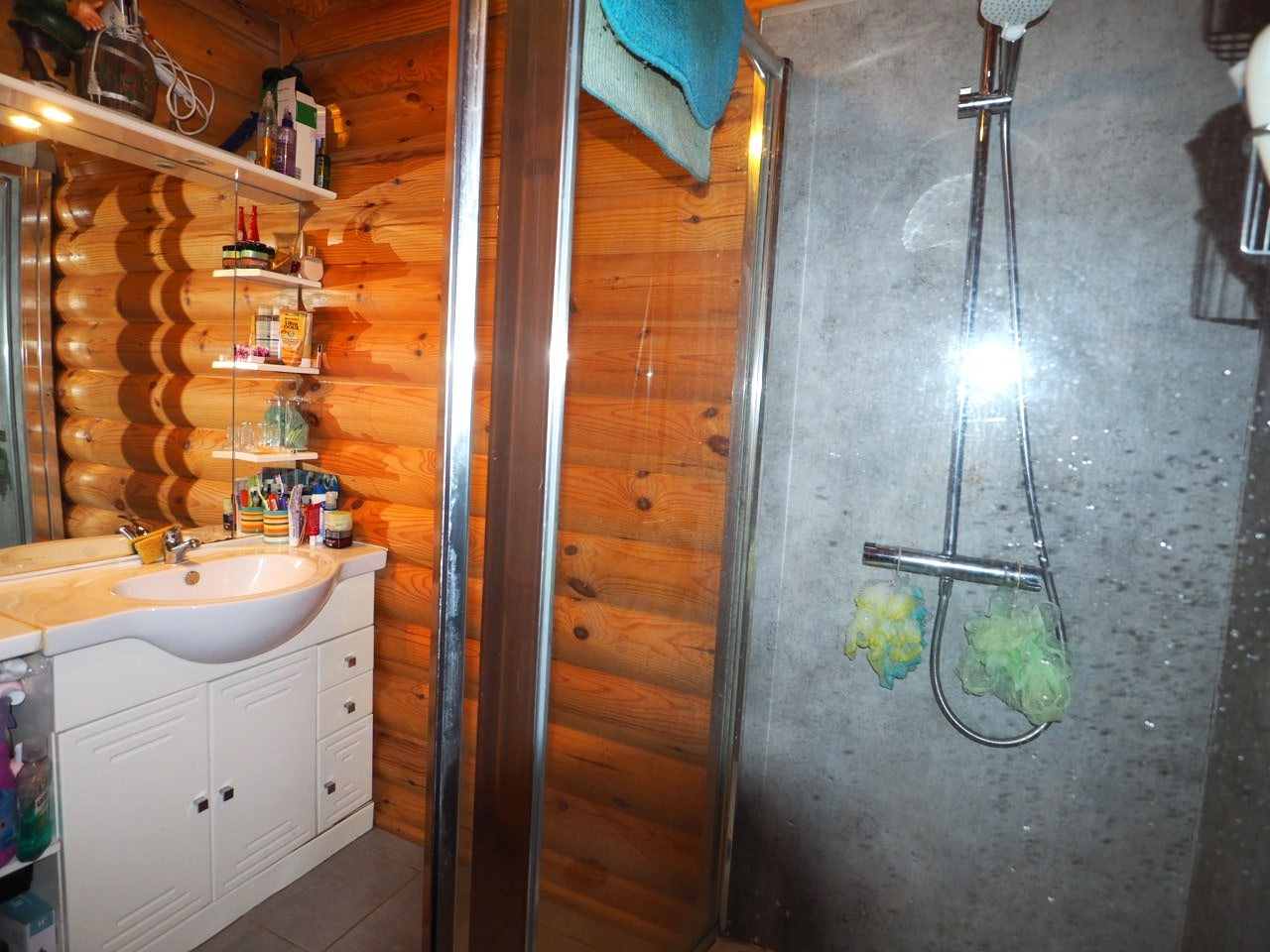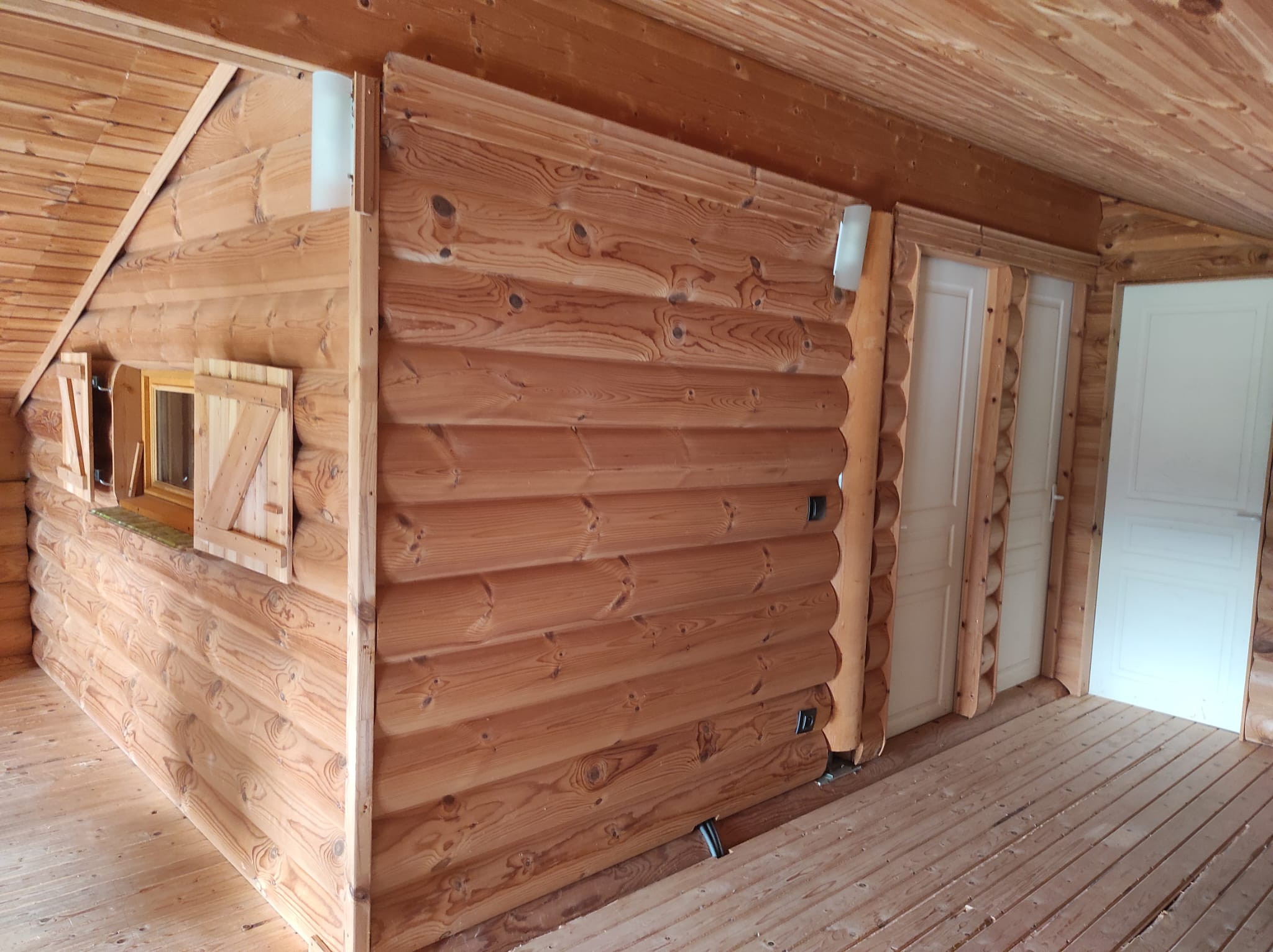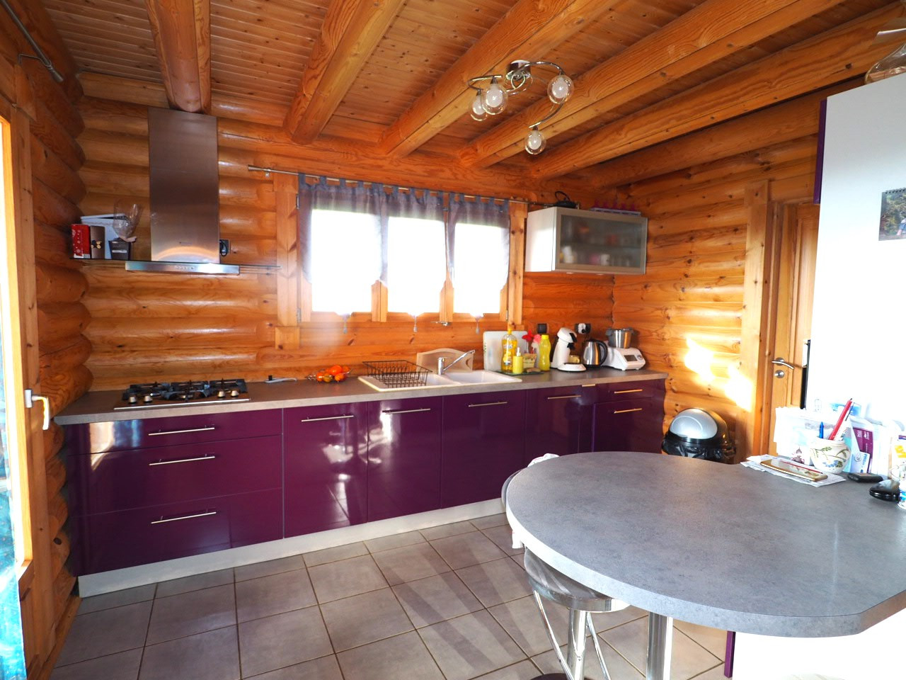 - rdc: entrée, wc séparés, coin cuisine aménagée avec une porte vitrée ouvrant sur la terrasse Sud-Ouest, grand séjour de presque 30 m2 avec poêle à granules et 2 portes-fenêtres ouvrant sur une grande terrasse Sud, espace nuit comprenant des rangements, 2 chambres et une salle d'eau.