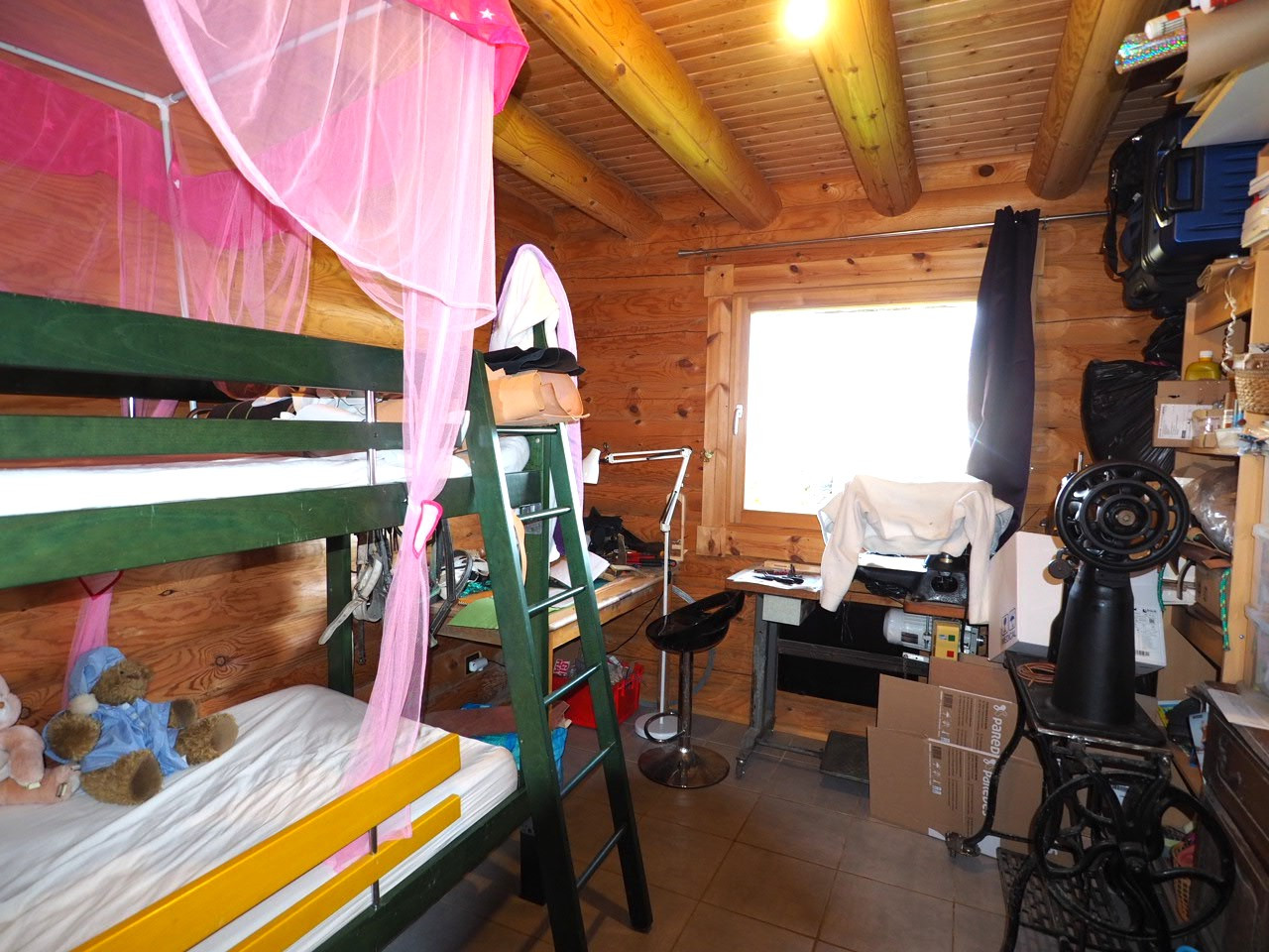 - étage: espace cloisonné en 3 petites pièces et espaces sous pente faisant office de greniers. Possibilité de faire une 3ème chambre avec une salle d'eau.
